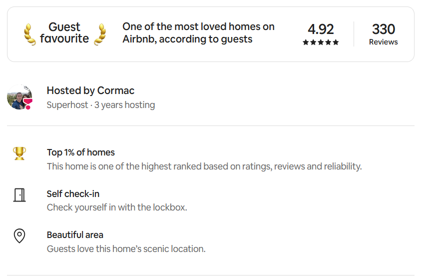 The Dispensary Daingean has a 4.92 rating with over 330+ reviews on Airbnb! We are in the top 1% of properties and are experienced hosts who have been operating since November 2022. Book direct through this website for our best rates or you can call or message 085 120 2395.